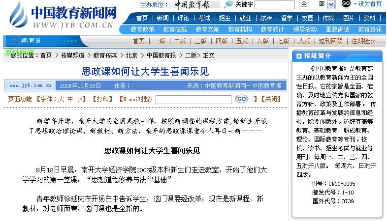 中国·必威(西汉姆联)官方网站-betwayspo马克思主义教育学院是全国最早开展思政课改革的4个试点单位之一。本学期,学院的7名教师承担了全校3000余名新生“思想道德修养与法律基础”课程任务。作为天津市思政课教师的培训基地,这所学院的教师们整个春天和夏天都在忙碌中度过。他们放弃休假,研究大纲,撰写教案。8月份,领到散发墨香的新教材之后,又集体备课,一遍遍地试讲,并利用暑假对天津高校的同行们进行了培训。