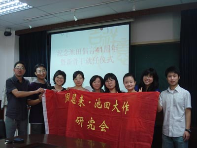 随后,周恩来•池田大作研究会举行换届仪式,新老骨干交接会旗,发言,并合影留念。“一人立起,从我开始,日新月异,我们开拓明天。”在两国同学共同演唱的中日文双语会歌《我们的誓愿》的优美歌声中,纪念活动圆满闭幕。