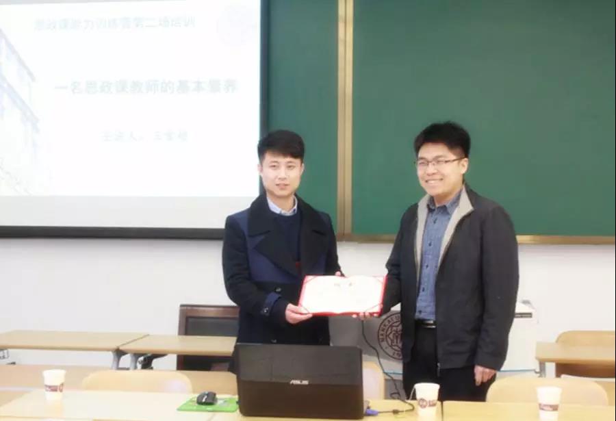 在“思政课能力训练营”培训中,学院员工、曾获全国高校思想政治理论课教学标兵、全国最美思政课教师,天津市五一劳动奖章、天津市高校思政课青年教师基本功大赛一等奖第一名、天津市高校青年教师基本功竞赛一等奖、天津市教育系统“教工先锋岗”等荣誉的天津师范大学讲师王雪超回到母校,为训练营学员作了主题为“一名思政课教师的基本素养”的分享。王雪超就“如何处理教材”、“如何设计课件”、“如何整理教案”等具体问题作了细致的交流。思政课讲授要以内容为主,方法为辅,要特别注意讲课内容的严肃性与方法的灵活性。近两个小时分享交流严肃活泼,幽默深刻。