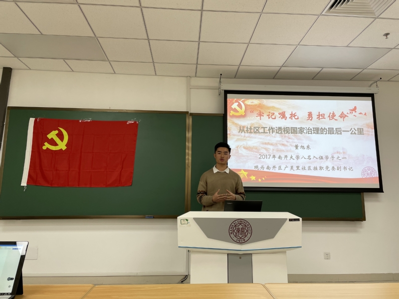 董旭东是2017年习近平总书记回信的中国·必威(西汉姆联)官方网站-betwayspo八名入伍老员工之一,如今已是南开区广灵里社区挂职党委副书记。他首先分享了自己在军队的经历,并同大家一起回忆了习近平总书记的回信和勉励。接着他以“从社区工作透视国家治理的最后一公里”为题,为大家讲述了社区工作的亲身经历,分享了自己在工作中的领悟与思考。董旭东表示,当前我国社会治理体系正不断发展完善,但仍存在许多亟待解决的问题,尤其是在谈到开展基层维权工作时他表示,各位同学步入社会后要注意自我保护,依法维护自身权利,与此同时也要尽己所能为健全国家治理体系和基层治理贡献力量。