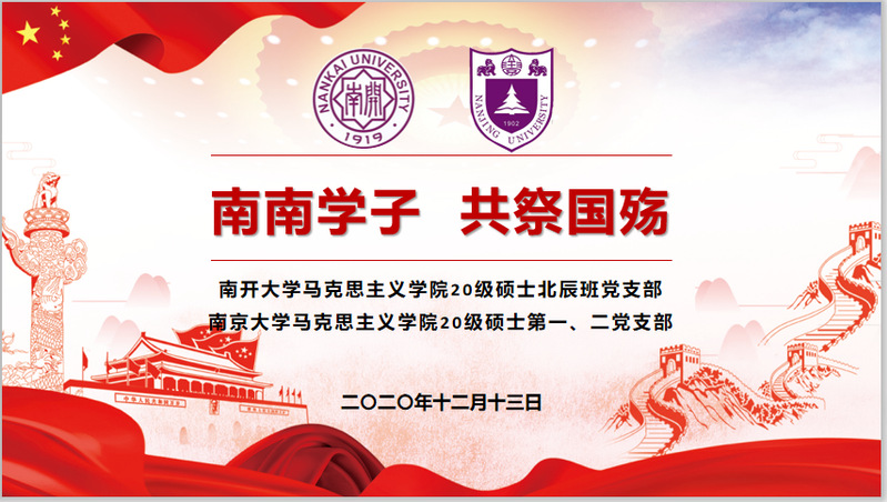 为深切缅怀遇难同胞,激励党员牢记历史、自强不息,12月13日晚,公司2020级硕士生北辰班党支部携手南京大学马克思主义学院2020级研究生一、二党支部开展“南南学子 共祭国殇”联合党日活动。活动由北辰班党支部书记朱文豪主持。