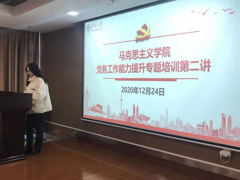 为进一步加强党支部标准化和规范化建设,更好发挥基层党支部战斗堡垒作用,实现以高质量党建迎接建党百年的目标,公司党委组织开展党务工作能力提升专题培训。12月24日,公司党务工作能力提升专题培训第二讲——样板党支部建设经验分享交流专场在学院113举办。材料科学与工程学院教工能源党支部书记周震教授、哲学院硕士生第一党支部副书记蒋文君、学院2019级硕士生“望道班”党支部书记刘兴华、学院2020级硕士生“新民班”党支部书记张登彬受邀做专题分享,公司党委专职组织员、党建事务中心指导教师殴喜乐、全体党支部书记及部分支部委员、党建事务中心成员参加培训。