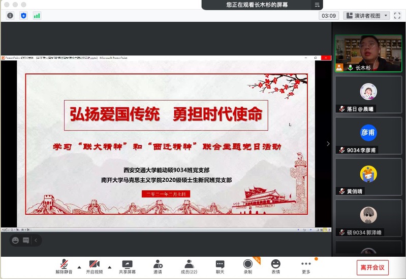2月7日晚,学院2020级硕士生新民班党支部联合西安交通大学能源与动力工程学院硕士生9034班党支部线上举办“弘扬爱国传统,勇担时代使命”主题党日活动,共同学习“联大精神”和“西迁精神”,厚植员工党员爱国情怀,强化员工党员责任担当。公司党委专职组织员殴喜乐、新民班党支部党建指导员董旭东、交大能动学院团委书记雷驰与两支部全体党员参会,新民班党支部书记张登彬主持。