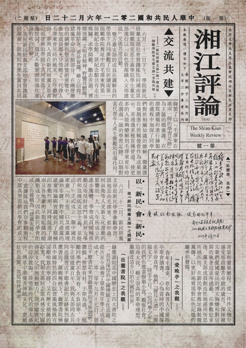 传承红色基因,“新民”再会“新民”。本次实践,支部成员们对相继走访了新民学会旧址、湖南第一师范学校旧址、李富春故居、毛泽东故居、党史陈列馆、岳麓书院、橘子洲等10余处红色旧址,搜集历史文献、形成实践调研报告数万字;仿照设计排版《湘江评论(复刻版)》共3期,以还原历史的方式展现调研团实践历程;录制剪辑《新民》vlog视频10余分钟,以“新民”为主线记录、讲述新民学会精神的历史与现实;实景拍摄《新民学会,建党先声》、《毛泽东与湖南一师》等4节主题微党课共60余分钟,在加强支部党员自身党史理论素养的同时,身体力行传承红色基因。