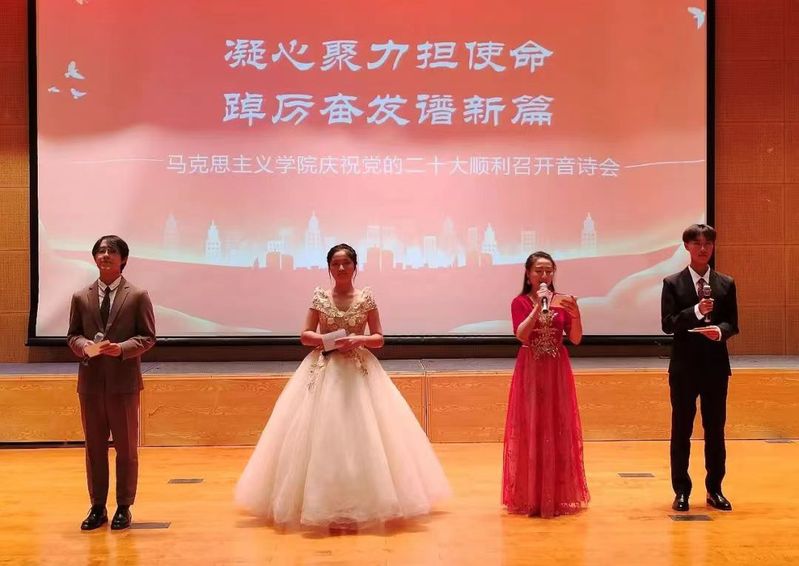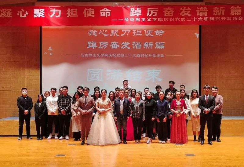 本次晚会马院师生齐聚一堂,共同庆祝党的二十大胜利召开,以青春之歌礼赞党的二十大。晚会分为“不忘初心,迎难而上展宏图”“冲锋吹响,笃行不怠里程长”“矢志不渝,百年波澜创巍峰”三个篇章。
